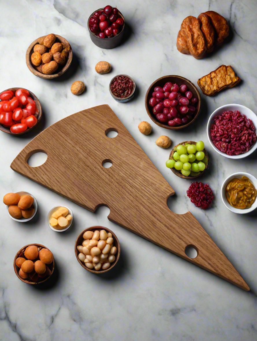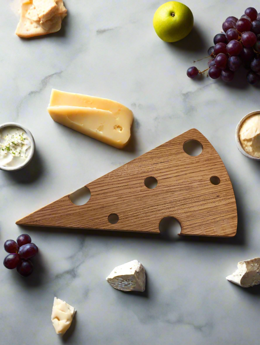 This hand-made cheese board is a must-have for any creative entertainer. Hand-crafted to resemble a piece of Swiss cheese with its iconic bubble holes, it adds a playful touch to any gathering. With its 8-inch width and 15-inch length, it's the perfect size for a selection of 3-4 cheeses. Elevate your charcuterie game with this unique, high-quality board.