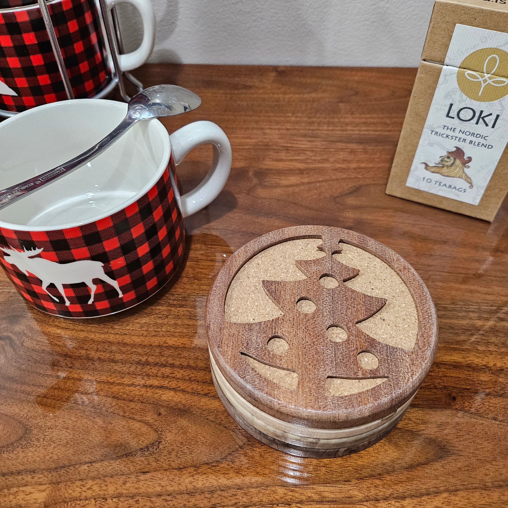 A Quartet of Hardwoods: Experience the diversity of nature with each set comprising coasters made from sapele, walnut, wormy maple, and poplar. This selection showcases a range of colors and grain patterns, from the rich, deep tones of walnut to the distinctive textures of wormy maple, adding a unique touch to your holiday decor.