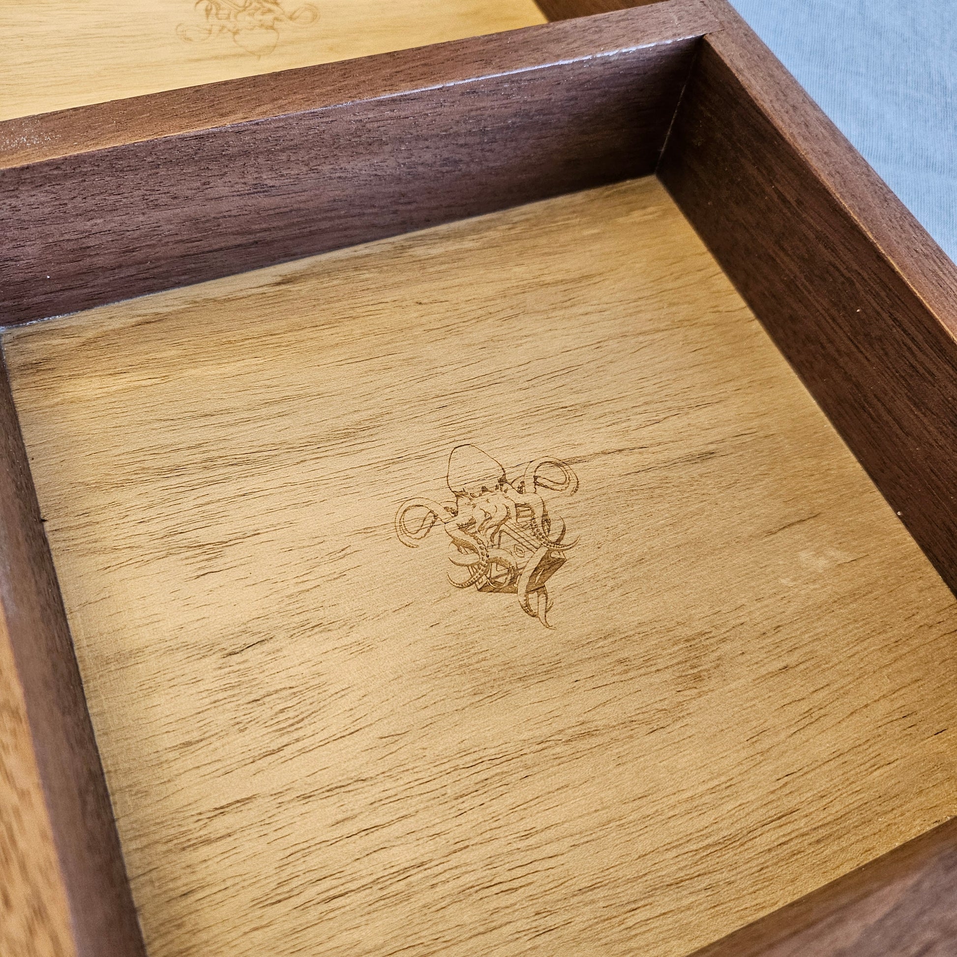 Available in Three Elegant Woods: Choose from Walnut, Cherry, or Maple to match your gaming style. Each wood option offers its unique charm, from the deep, rich tones of Walnut to the warm, inviting hues of Cherry, and the light, clean look of Maple. The tray's contrasting color base – light wood for Walnut and dark stained wood for lighter frames – adds a striking visual appeal.