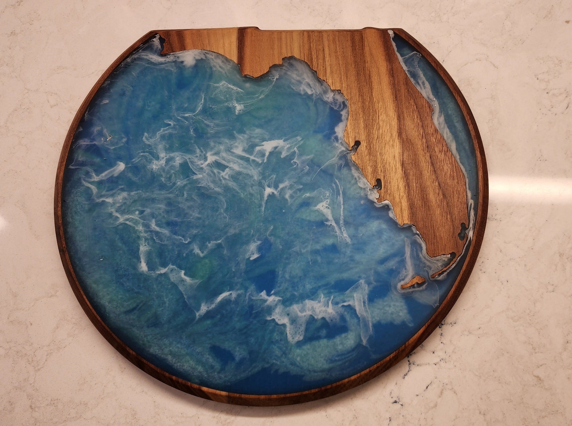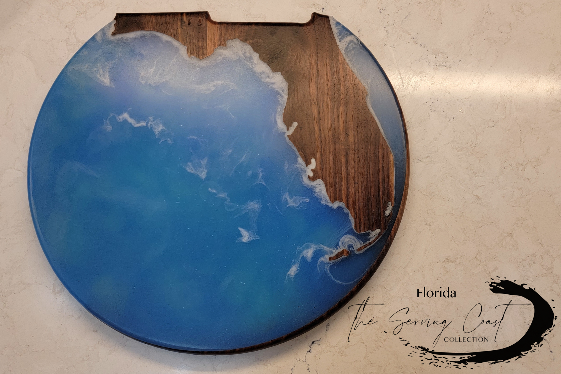 Celebrate Florida's Coastal Beauty: Each tray is skillfully shaped into a circular form, representing the roundness of Florida's coastline with an artistic twist. The use of colored epoxy resin to illustrate the surrounding ocean and Gulf waters captures the essence of Florida's beaches and bays, creating a mesmerizing effect that is both visually stunning and evocative of the state's coastal vibe.