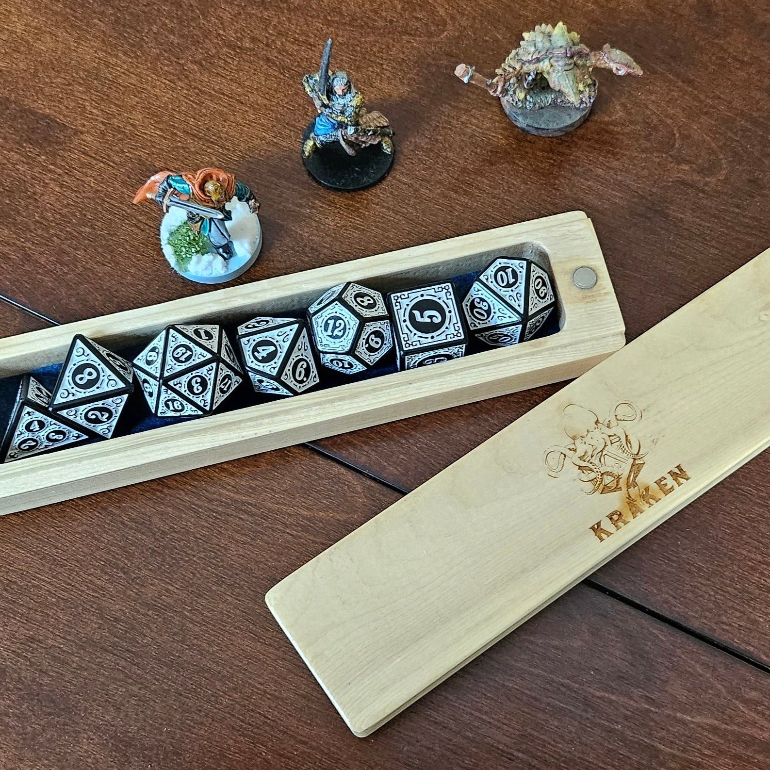Unyielding Protection by the Kraken: Let the mythical Kraken be the guardian of your luckiest dice. Our vault, featuring rare earth magnets, ensures a secure closure while allowing easy access. The Kraken's emblem, the sole adornment, symbolizes strength and mystery, enhancing the natural elegance of the hardwood.