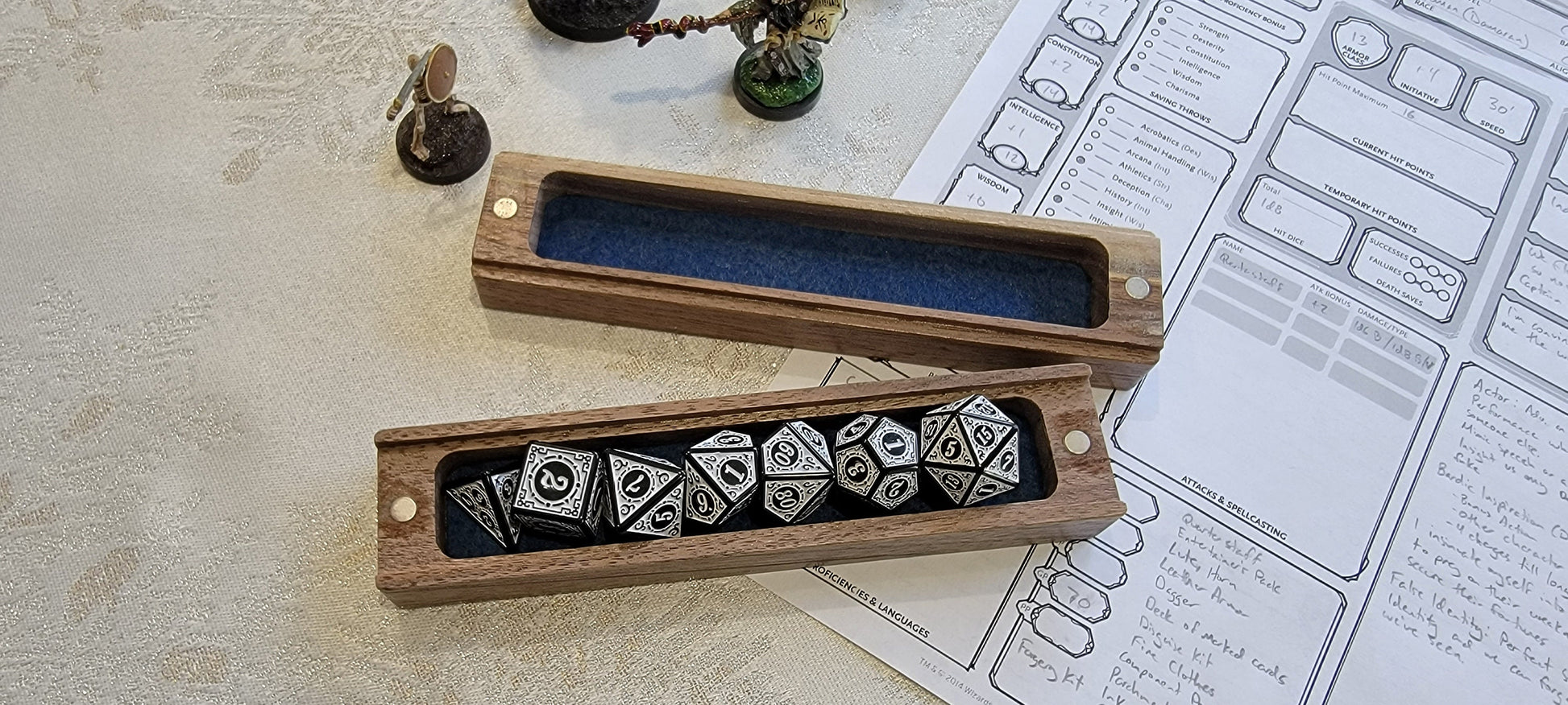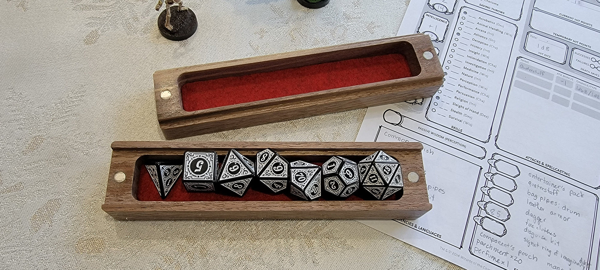 Designed for the Avid Gamer: Measuring 6.5" in length, 1.5" in width, and 1.375" in height, this vault comfortably houses a complete D20 dice set, including a 20mm D20, D12, 2D10, D8, D6, and D4. The dice rest in a wool-felt lined slot, measuring 1" wide and 5.5" long, providing both protection and a touch of luxury.