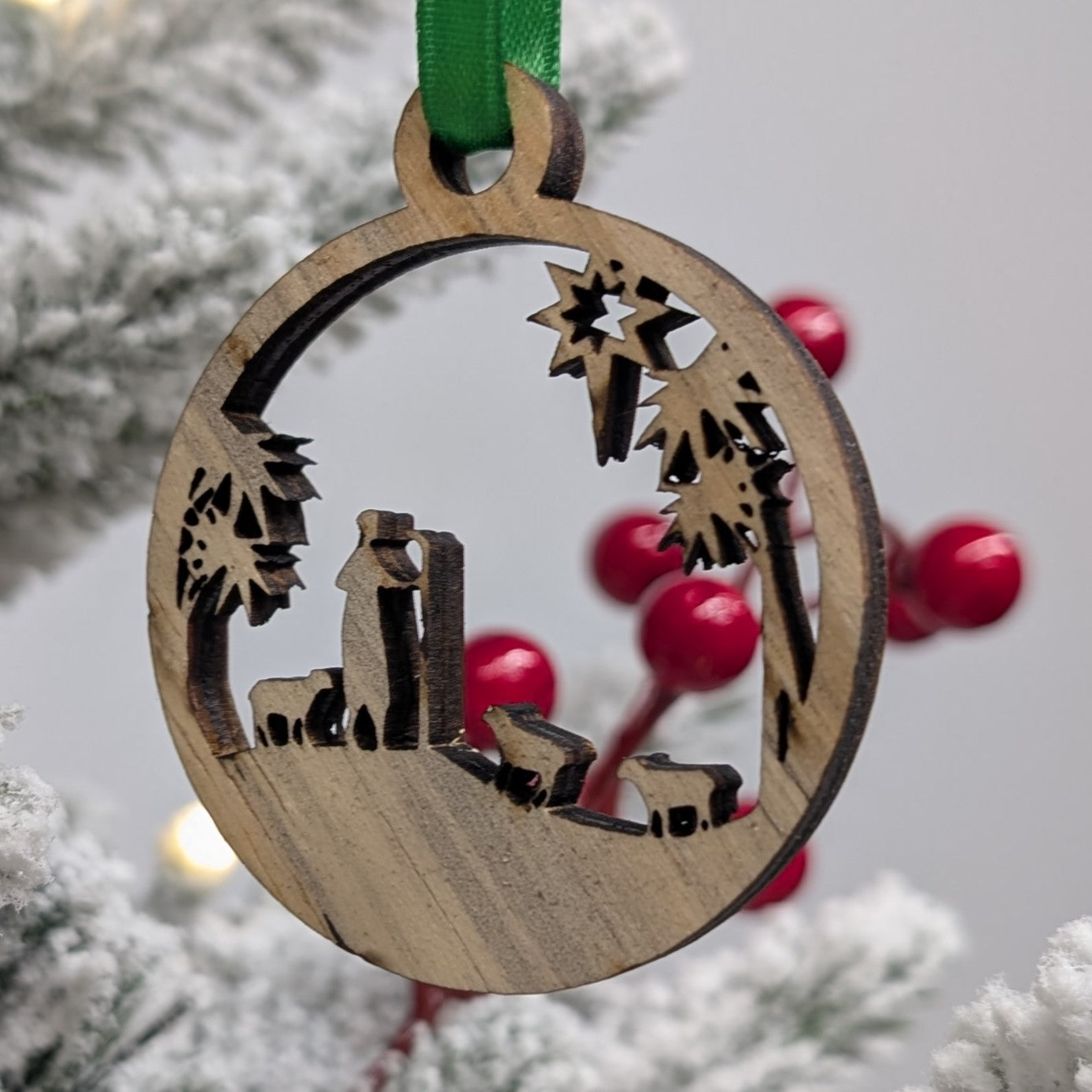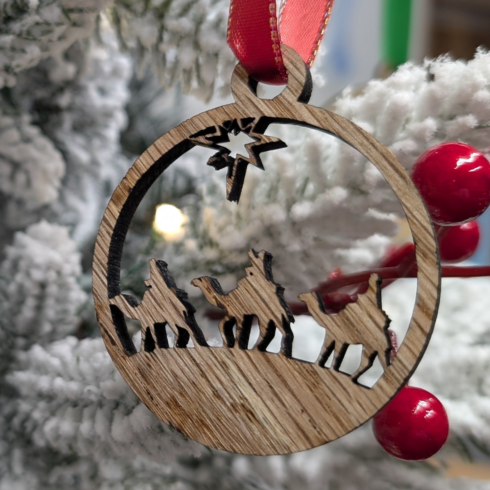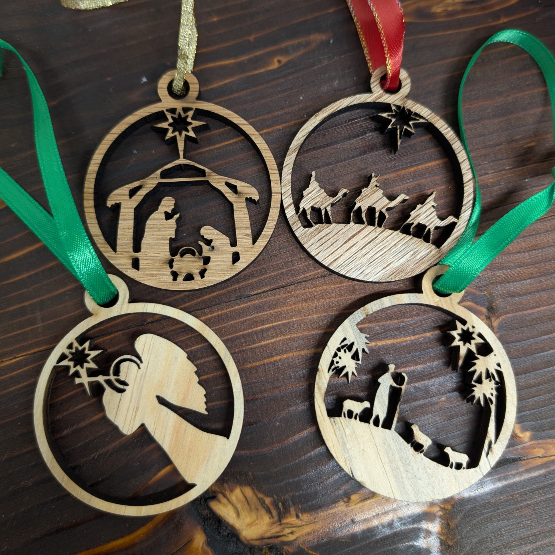 Every detail is precision-cut to honor the sacred story of Christmas, while the reclaimed wood adds warmth, sustainability, and unique character to each piece. These ornaments are perfect for adorning your tree, sharing your faith, or gifting as heartfelt keepsakes to loved ones.