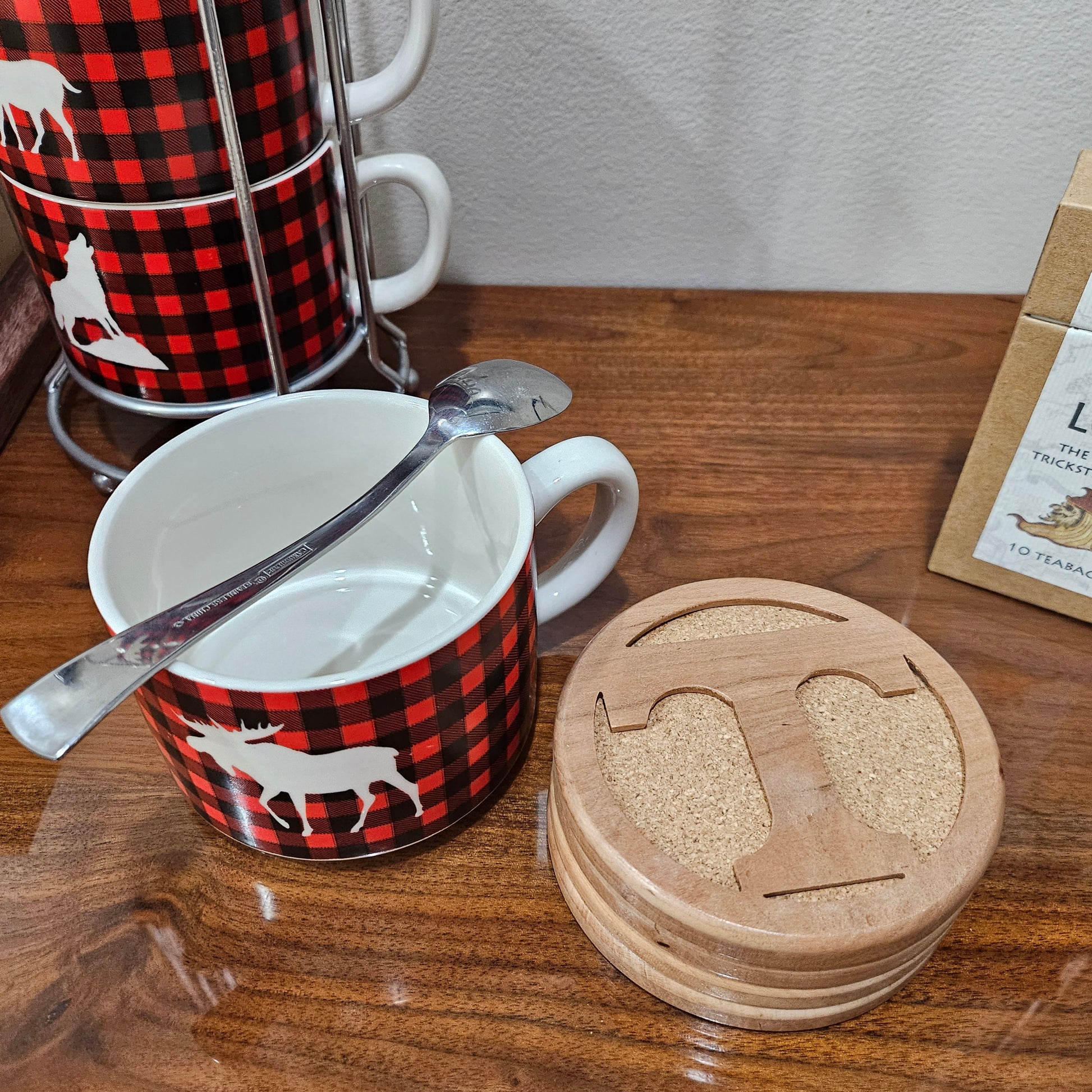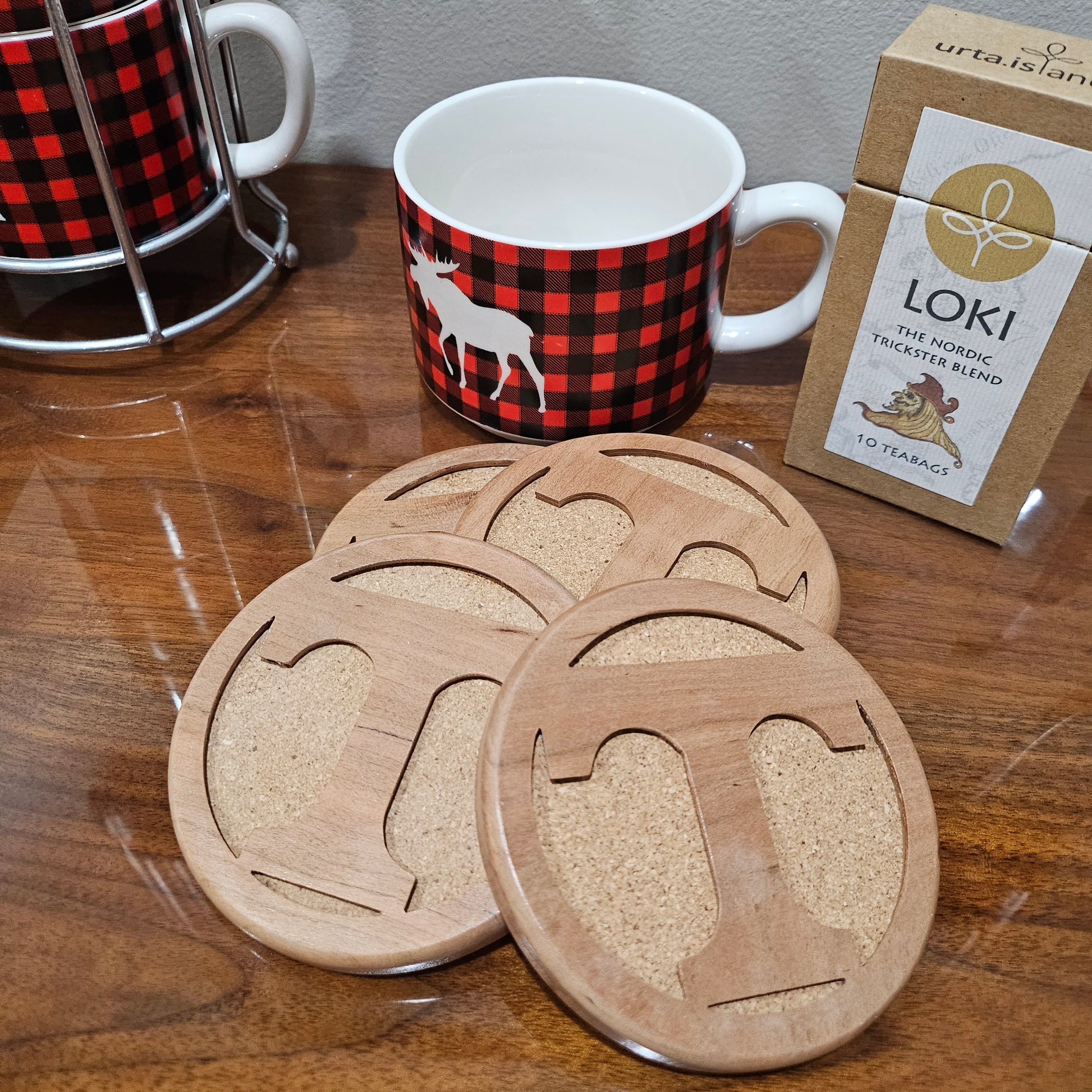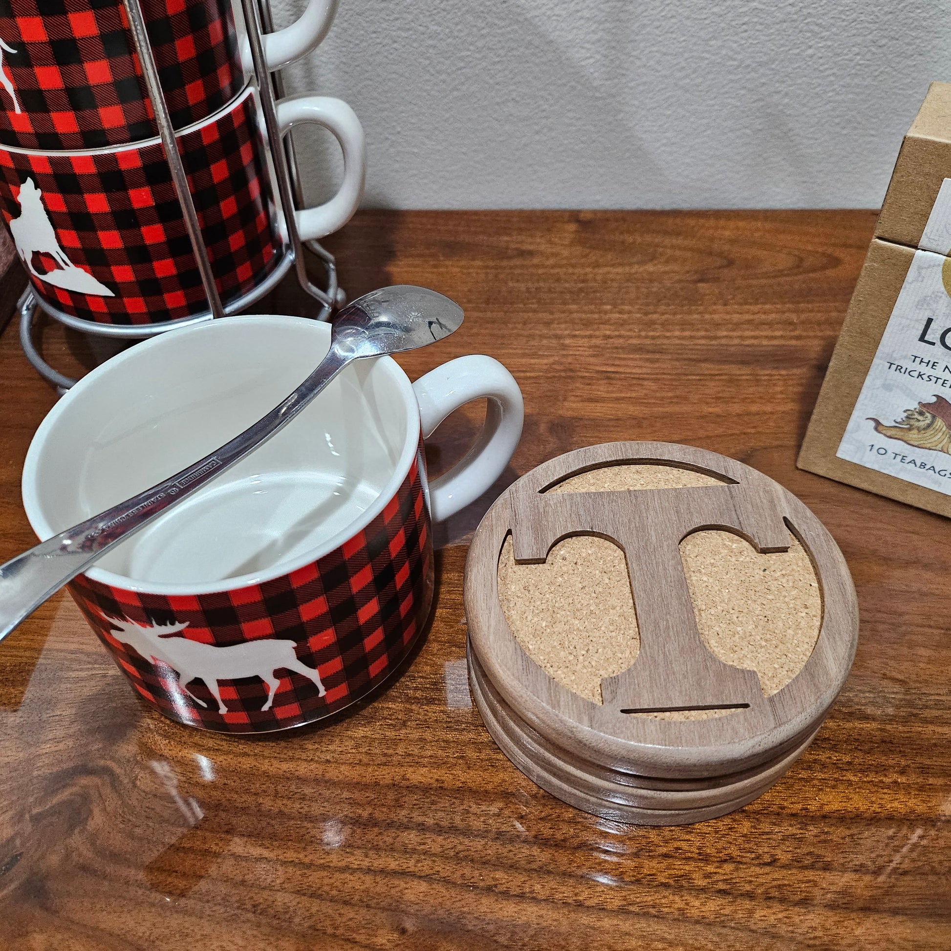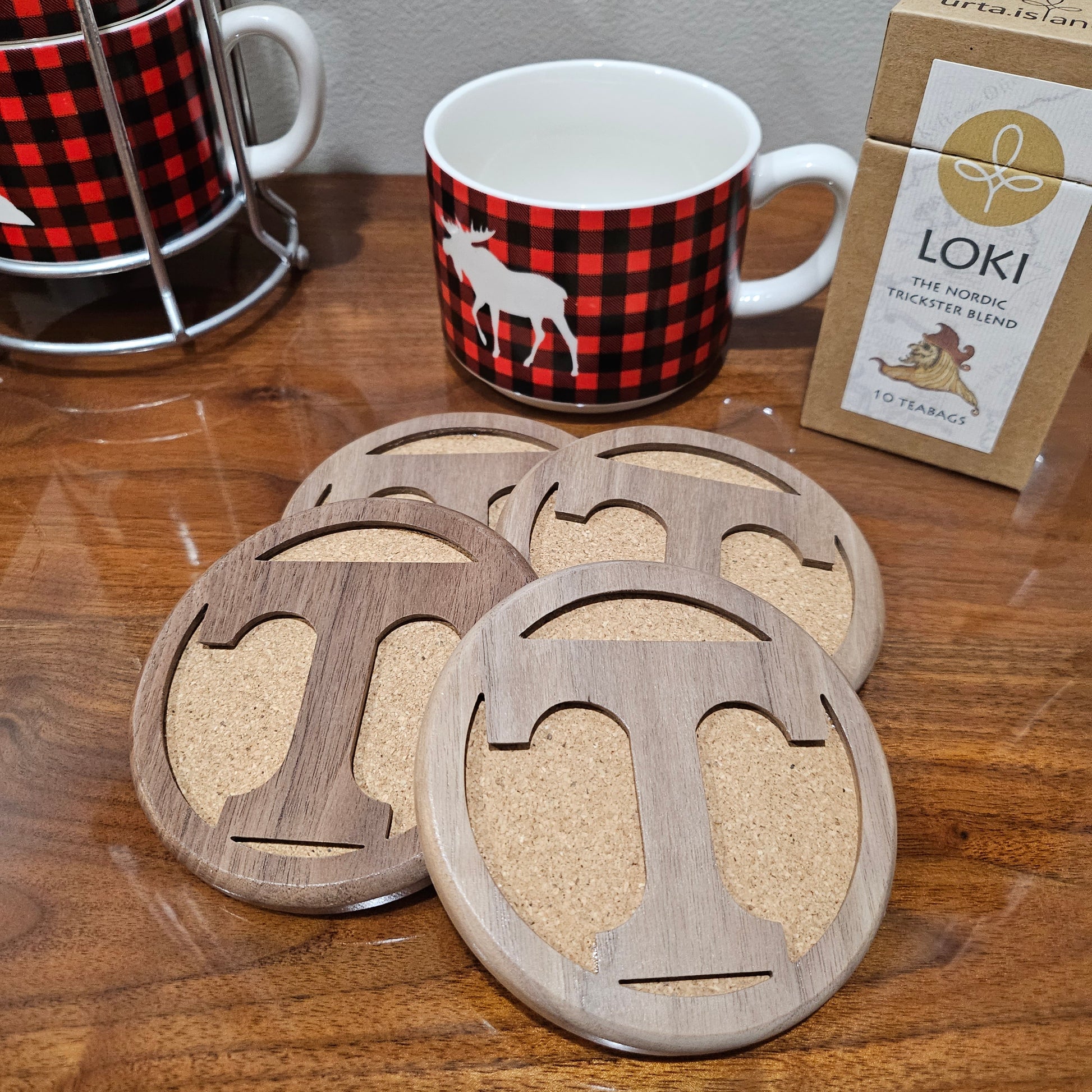 Innovative Design Meets Functionality: Each coaster features a bold design inspired by the iconic "Power T," capturing the essence of spirited community. Made from solid cherry or walnut, these coasters offer the classic beauty of wood on the front. The back is fitted with a cork insert, combining the aesthetic appeal of wood with the absorbent benefits of cork, keeping your surfaces dry and clean.