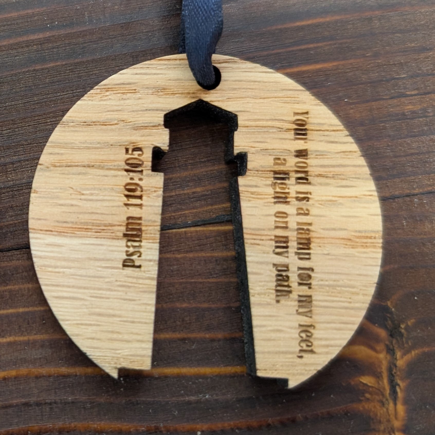 Celebrate the light of the Lord with our beautiful Lighthouse Ornament by Dusty Duck Designs. Thoughtfully crafted from wood, this design features a striking lighthouse rendered in negative space, paired with the timeless words of Psalm 119:105: "Your word is a lamp for my feet, a light on my path."
